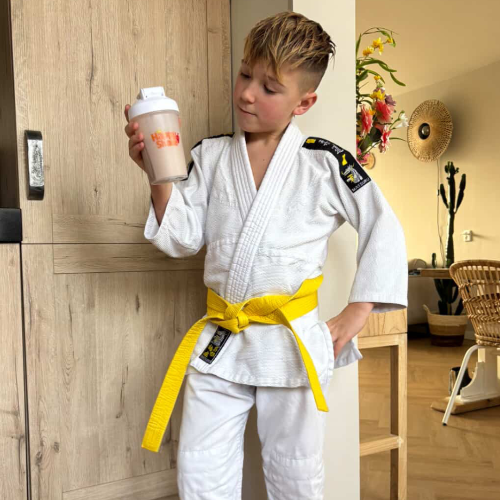 Voor hij gaat, drinkt hij zijn HappyShake — zodat hij met energie en focus kan knallen tijdens de les."